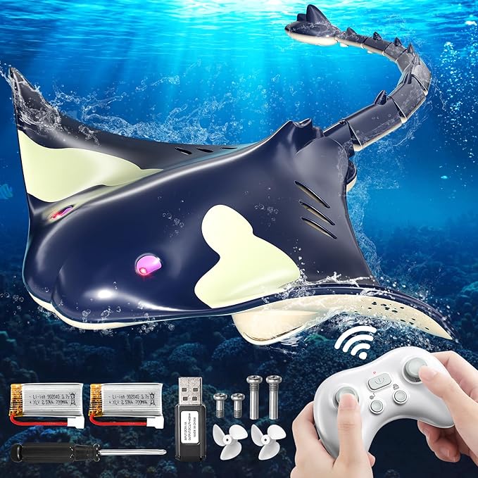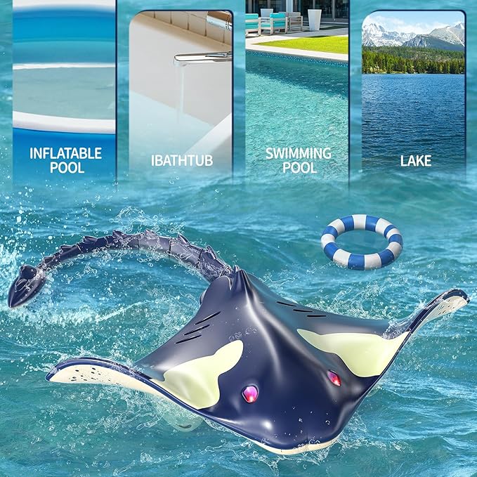 π】 Stylish Appearance】 The enormous and unusual body form of the marine species manta ray provides for a really fascinating aquatic spectacle that is sure to draw in onlookers. It also has a sense of mystery from the deep water thanks to its shimmering LED eyes.Hands-free Remote Controller π€½♂️ Watching it only from the shore is too dull! If the remote control could be submerged in the water as well, it would be an amazing feature! This time, we have improved the remote controller's waterproof feature so kids may play in the water with it without worrying about it getting wet. The 2.4GHz remote controller runs on two "AA" batteries (not supplied) and is easily operated up to a 100-foot range.π ️【 Various Uses & Simple To Use】The RC shark is readily controllable up to a hundred feet away with a 2.4GHz remote control. The lifelike shark toys may freely move in several directions at both high and moderate speeds in ponds, lakes, and rivers. Additionally, the indication light has been enhanced, and the water spray feature makes playing in the evening or after dark more enjoyable. Without a doubt, this is the ideal present for grownups or boys.π»【 route Programming】The remote control has the ability to pre-set the direction and distance of the manta ray, as well as its route. To play the preset behaviour, press the button one more. Children may play with Manta Ray toys or swim freely in the water without having to hold the remote control thanks to the preset feature, which frees up their hands.Two 700 milliampere rechargeable lithium batteries are included with the toy, which should provide you with adequate power for extended use.No regret decision πThis toy is without a doubt the greatest present for kids because, of course, playing outside is only enjoyable near the water during the hotter months. This manta ray toy may be played with in watery places including reservoirs, lakesides, and swimming pools. For holidays like Halloween, Easter, Christmas, and children's birthdays, it's ideal as a present for both boys and girls